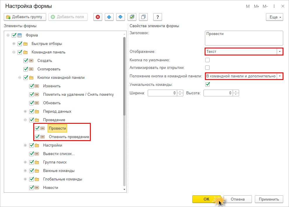 Шаг 6. Нажимаем кнопку «Еще», выбирая команду «Изменение формы». После этого разворачиваем группу «Проведение». Для команд «Отменить проведение» и «Провести» выполните одинаковую настройку: «Отображение – «Текст».