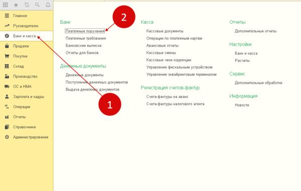 Для начала необходимо зайти в левой панели в раздел «Банк и касса», выбрать «Платежные поручения» . Будут видны все созданные до этого платежки.