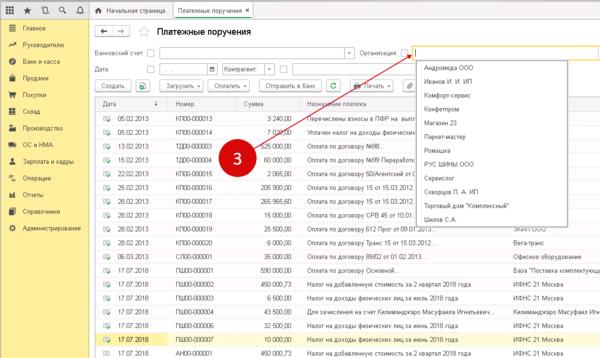 Далее в этом окне в столбце «Организация» следует выбрать ту организацию, по которой будет осуществлен обмен. Отобразится окно с перечнем всех платежек по этой организации.