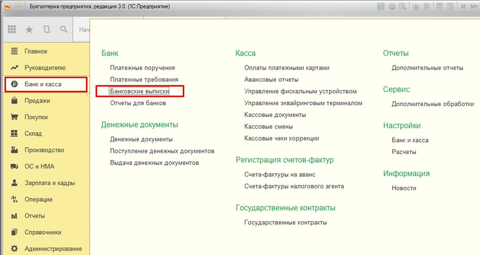 Первое обязательное действие – отправка распоряжения на приобретение валюты в уполномоченный на это банк. Разработка формы такого распоряжения прерогатива специалистов банка и включает в себя: обоснование необходимости покупки валюты, требуемую сумму средств и максимальный курс. Для перевода денег от организации потребуется сформировать платежное поручение. Реализовать это можно на вкладке «Банк и касса»: