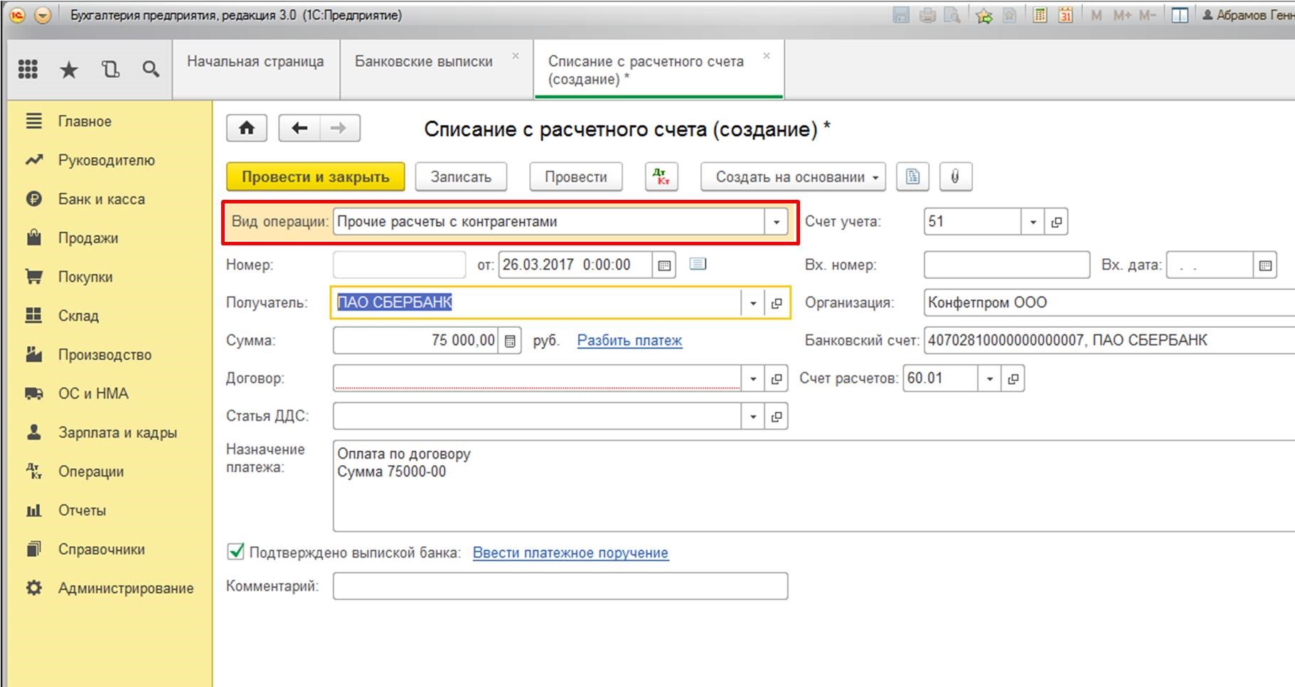 В бланке «Списание с расчетного счета» выберем нужное нам действие, в данном примере «Прочие расчеты с контрагентами»: