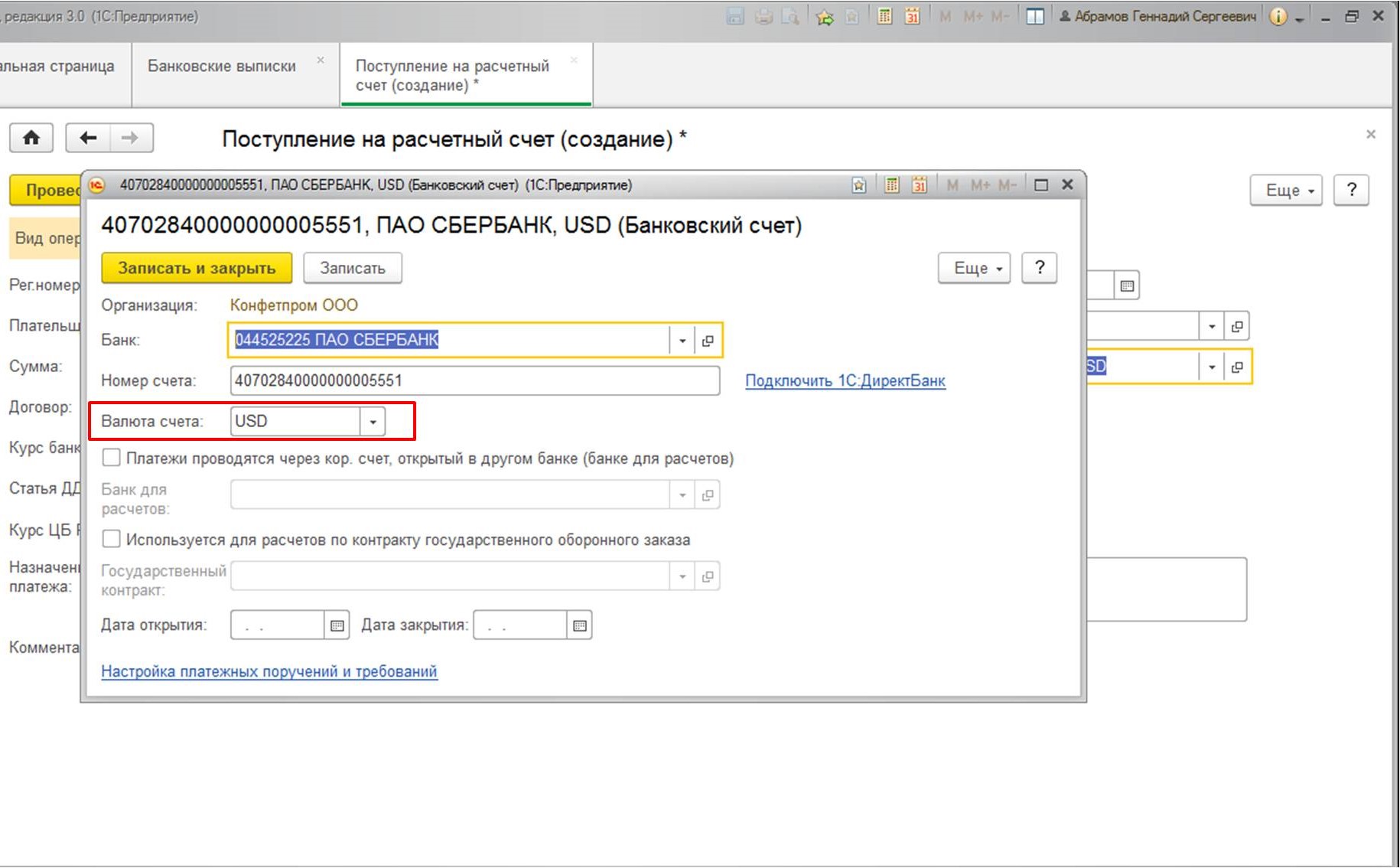 В момент покупки валюты банк выполнит списание необходимой для этого суммы со счета организации-покупателя. Оформление этой операции в 1С: