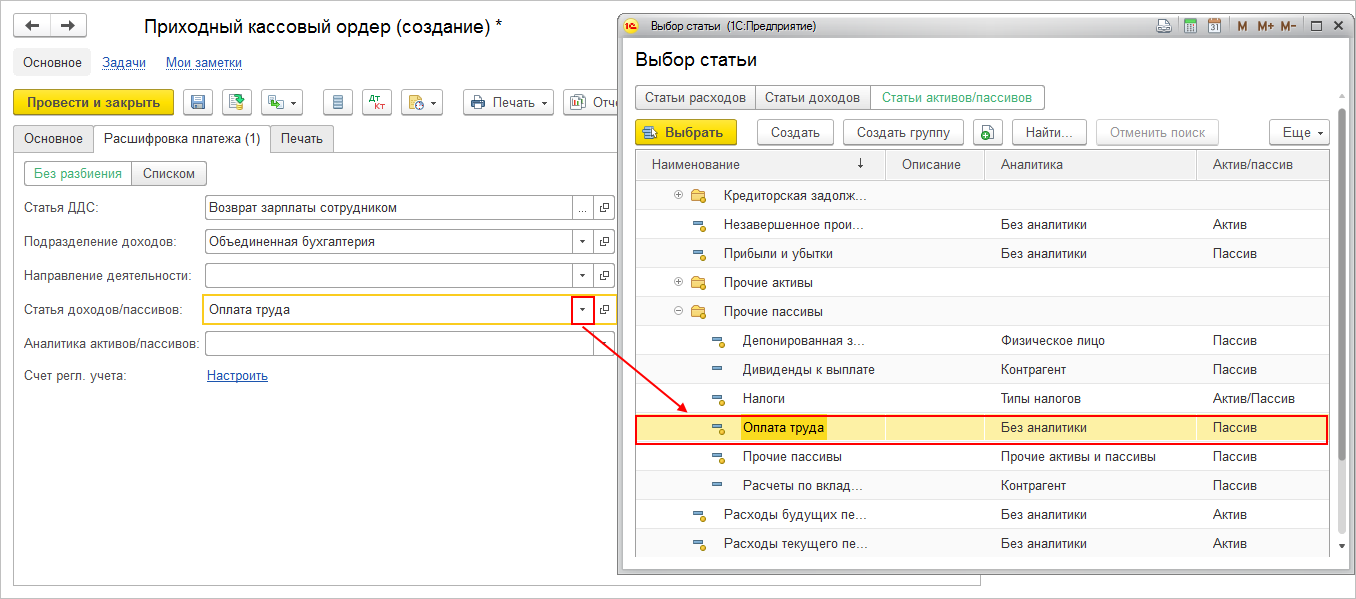 При выборе «статьи активов/пассивов», при выборе «Оплата труда», необходимо установить переключатель в положение «Статьи активов/пассивов»