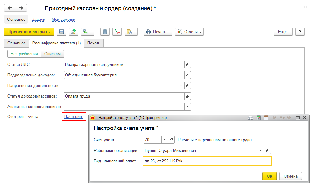 - Появится диалоговое окно, в котором следует указать счёт учёта, Ф.И.О сотрудника и вид начисления оплаты;