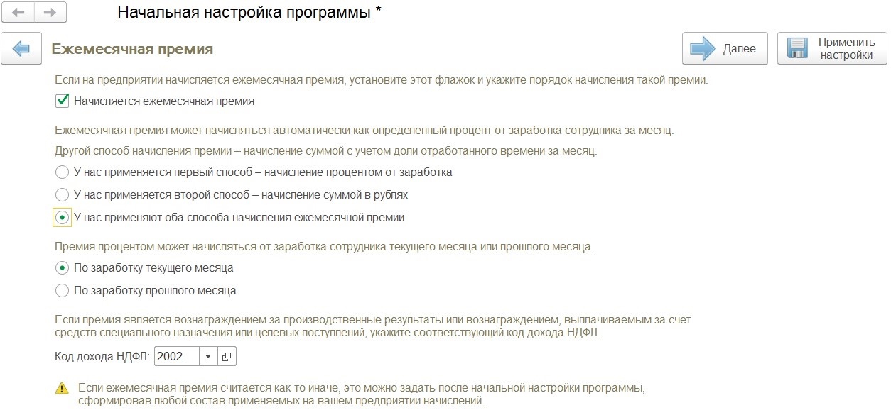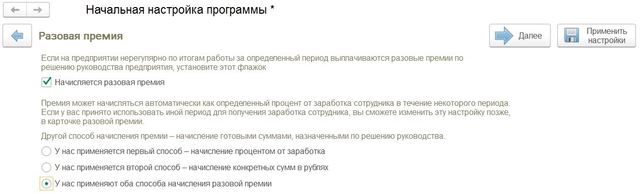 Помимо этого, помощник начальной настройки в случае выбора двух вариантов вычисления, сразу создаст и второй тип премии «Премия разовая (процентом)».