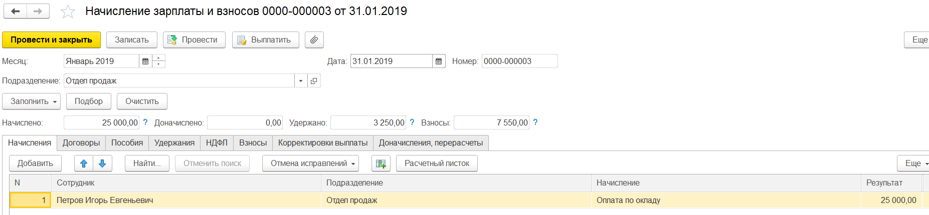 Работнику Петрову Игорю Евгеньевичу была рассчитана зарплата за январь 2019.