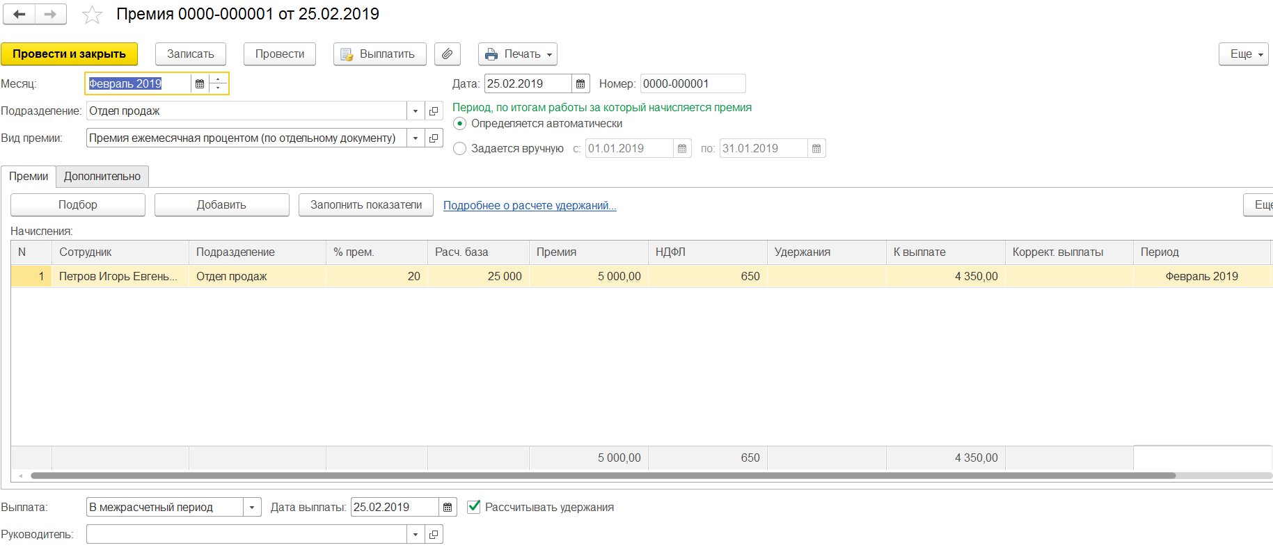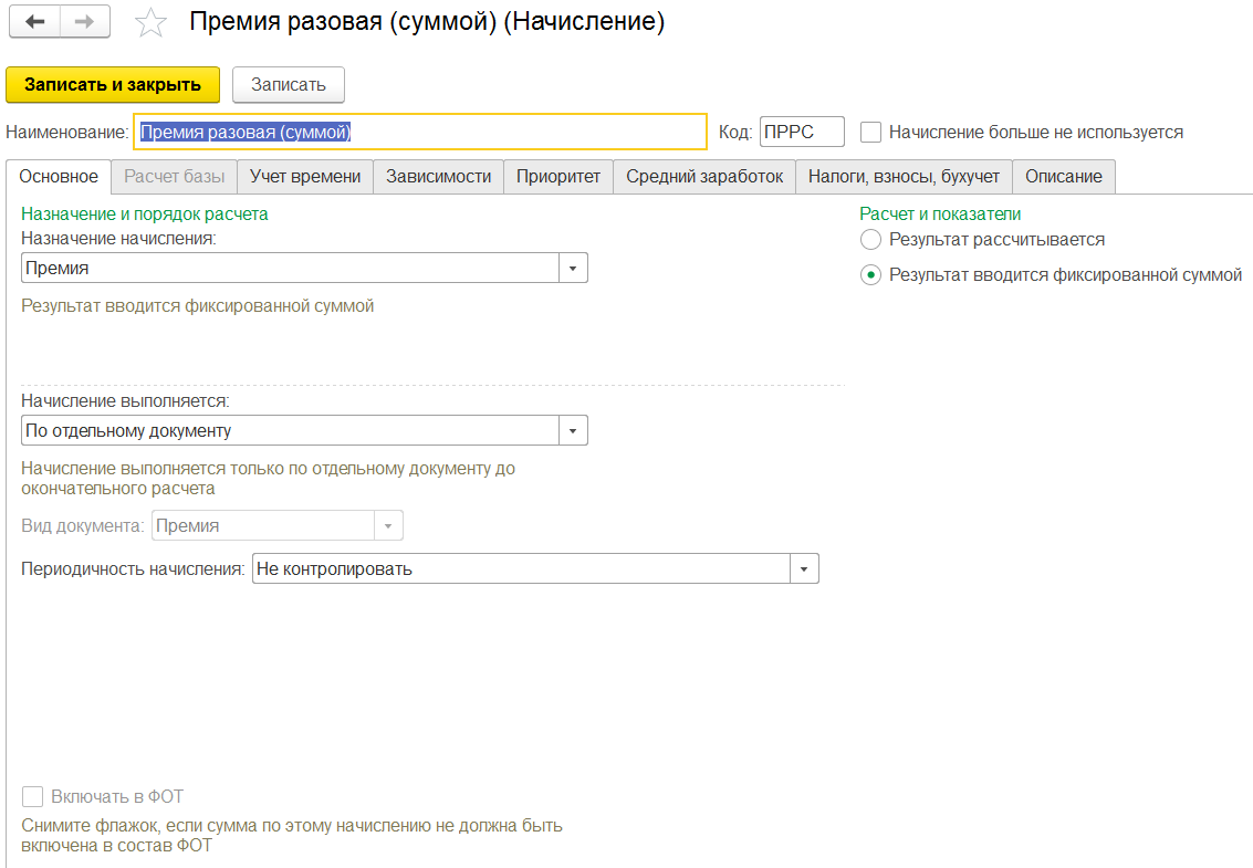 Программа создаст премию разовую (суммой), где будет формула суммой и документ «Премия».