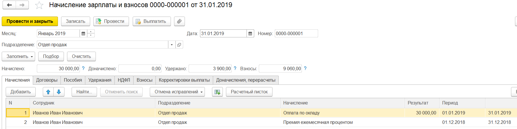 Давайте рассмотрим на примере. Работник Иванов Иван Иванович трудоустроен с 1 января 2019 года. Ему назначен оклад по дням в размере 30 000 рублей и премия за месяц 15%. Создаем начисление зарплаты за январь 2019. Подбираем работника. Постоянные начисления сами подтянутся в документ. Оклад по дням за интервал с 1 по 31 января 2019 и премия за интервал с 1 по 31 декабря 2018. Мы видим предыдущий месяц, однако, результат не рассчитан, так как работник у нас еще не был принят на работу в декабре 2018.
