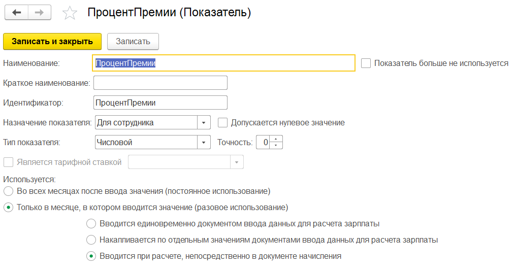 Заходим в меню «Настройка», «Показатели расчета зарплаты» и создаем показатель «Процент премии». В нем выбираем «для сотрудника», так как у каждого работника процент может меняться, и вводится при расчете, непосредственно в документе вычисления.