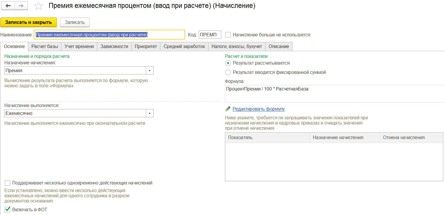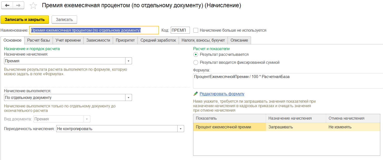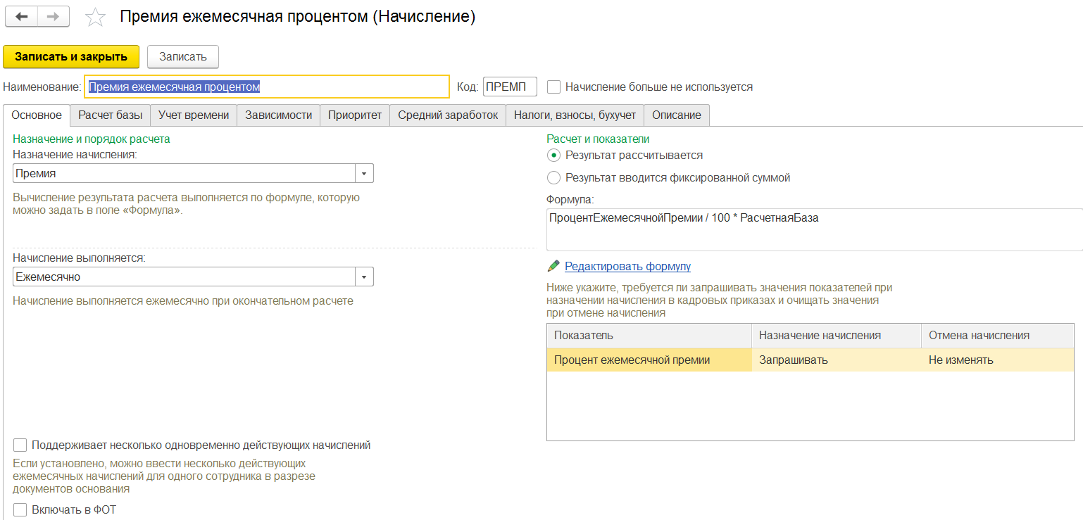 Программа создаст тип начисления «Премия ежемесячная (процентом)».