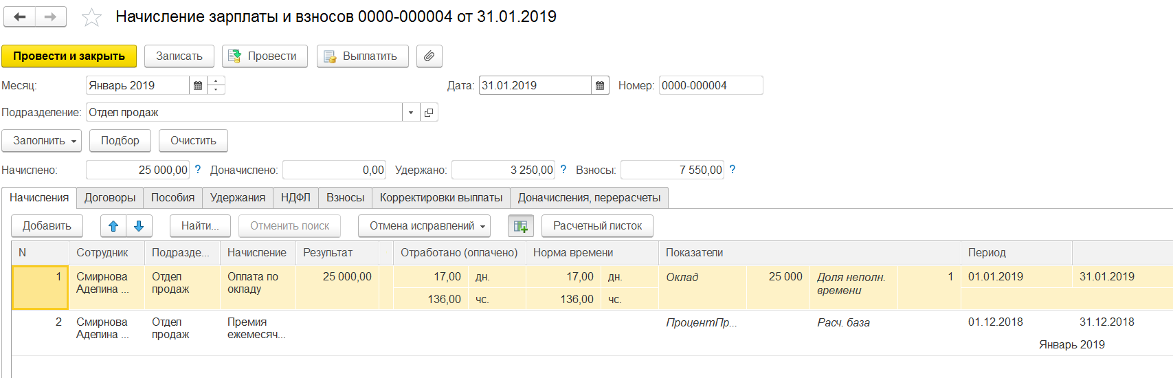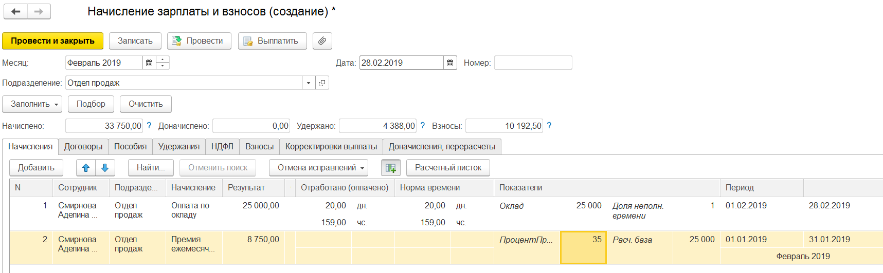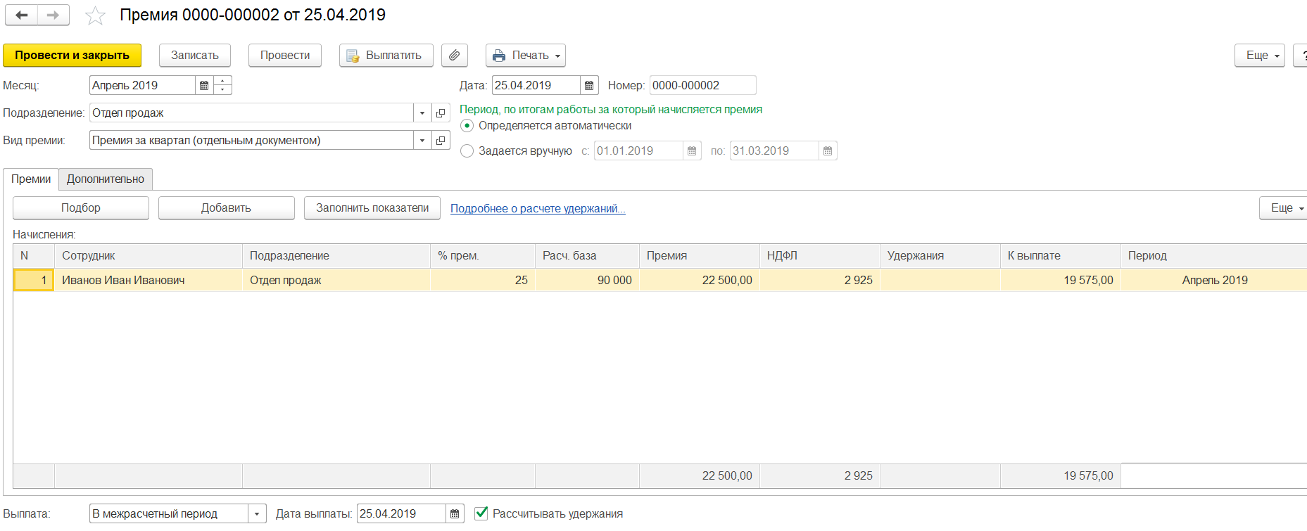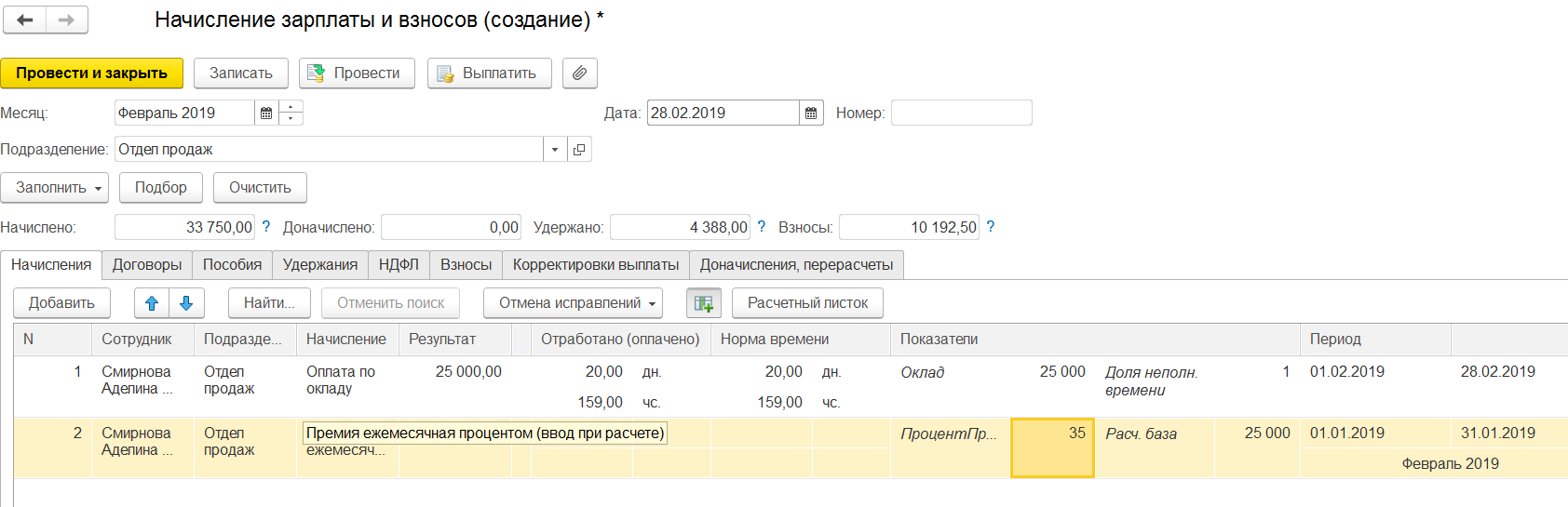 Заполним документ «Начисление зарплаты» за апрель. Автоматом подтянется премия за квартал.