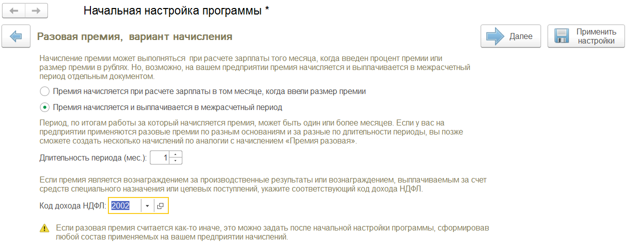 Далее необходимо выбрать, когда будем считать эту премию: в течение месяца или при расчете зарплаты, а также указать код дохода налога на доходы физлиц. Указать длительность расчетного интервала, за который будут браться данные.