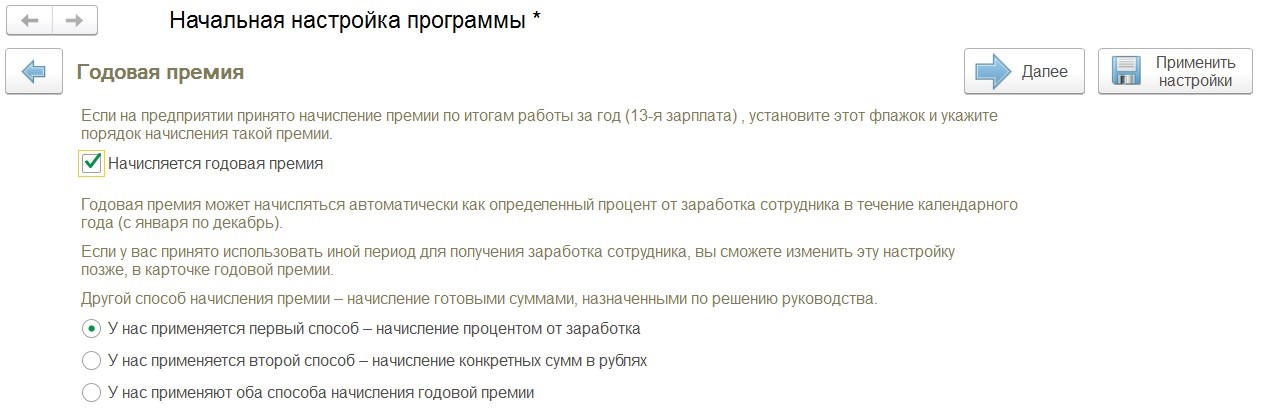 Если на вашем предприятии планируется годовая премия, в помощнике необходимо отметить флажок «начисляется годовая премия». Рассчитываться она может долей от дохода, а также суммой по приказу.