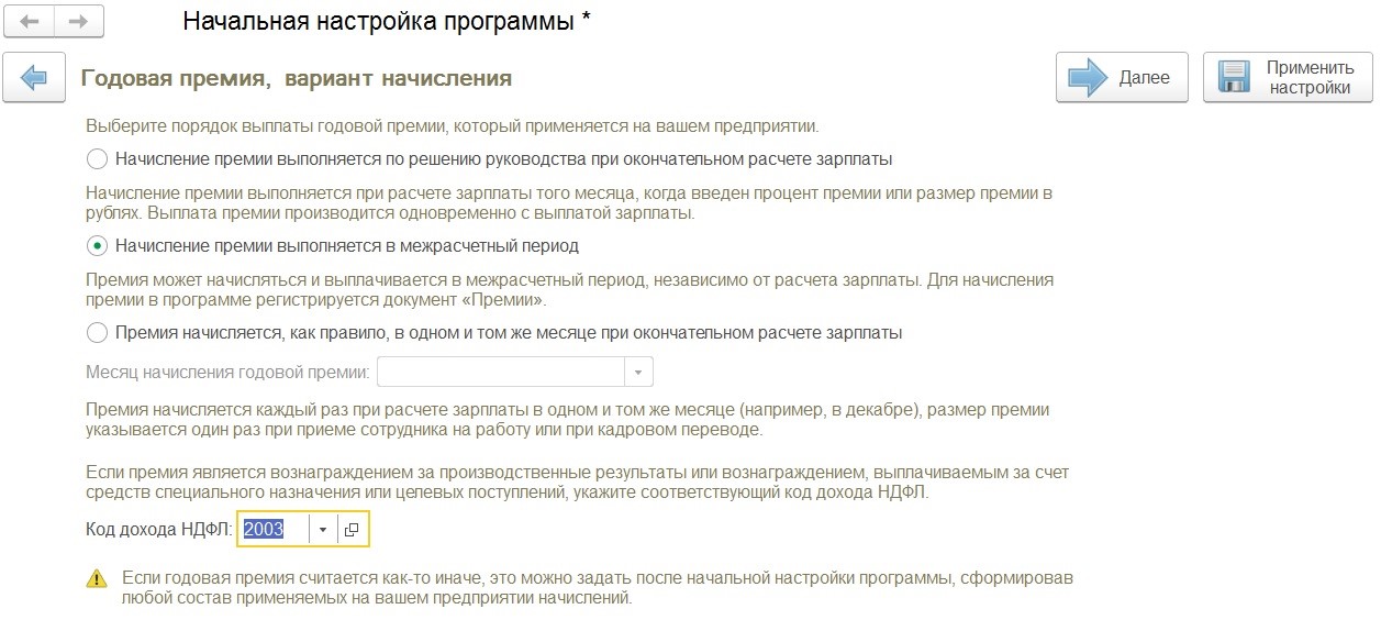 Квартальную премию можно начислять, когда введен процент премии, при итоговом вычислении зарплаты; премию можно посчитать документом «Премии» и выплачивать в середине месяца; премию можно начислять как постоянное начисление в заранее заданных месяцах. Эти настройки задаются далее в окне помощника.