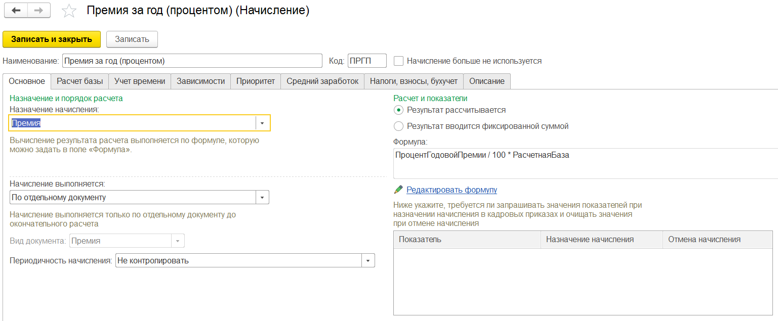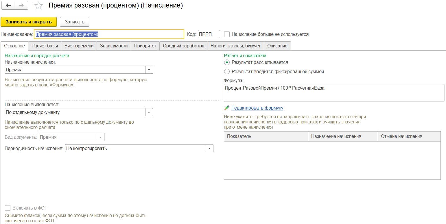Давайте рассмотрим формулу, которую сформировала программа. Процент разовой премии/100*Расчетная база, где «процент разовой премии» – это показатель, который задается при начислении для сотрудника, «расчетная база» – это сумма, от которой будет рассчитываться процент премии.
