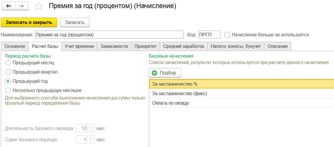 После этого зайдем в справочник «Начисления» и проверим базу расчета. Должен быть выбран пункт по итогам прошедшего года. Укажем состав начислений.