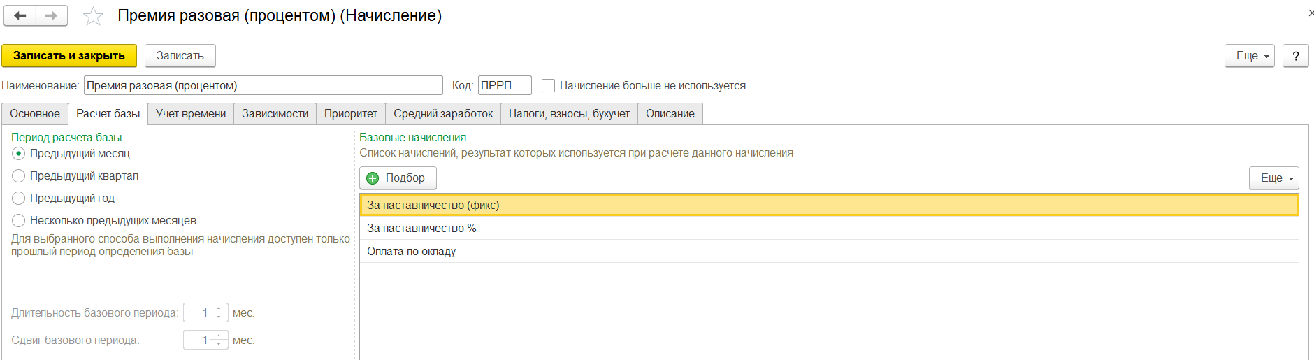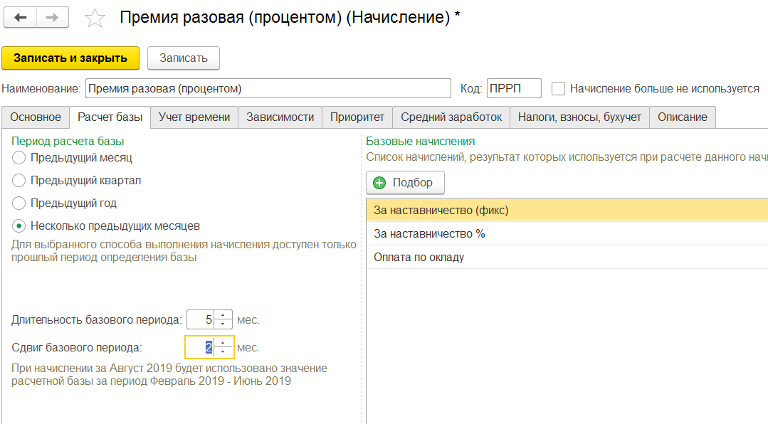 К примеру, если премия будет считаться по итогам предыдущего месяца, то в уже сохраненном типе начисления нужно поменять интервал расчета базы. Тогда при расчете заработной платы за февраль 2019, состав расчета премии будет за период январь 2019.