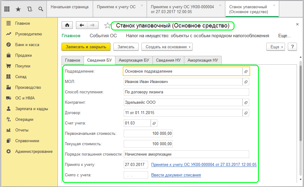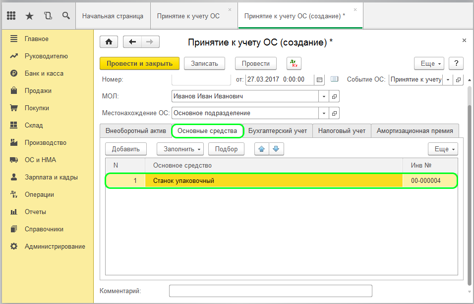 После этого можно проводить документ. Вся, внесенная сюда информация, автоматически перейдет в карточку Основные средства.