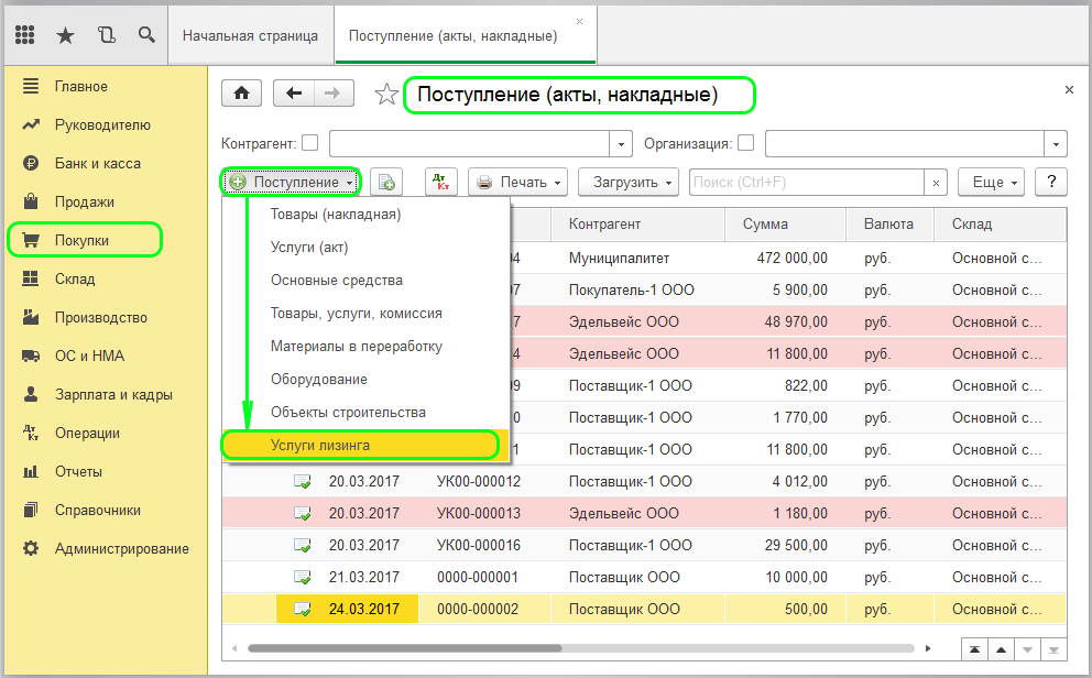 Теперь необходимо отразить лизинговый платеж. Для этого используется документ «Поступление». Чтобы создать его, следует перейти во кладку «Покупки», и указать вид операции «Лизниг».