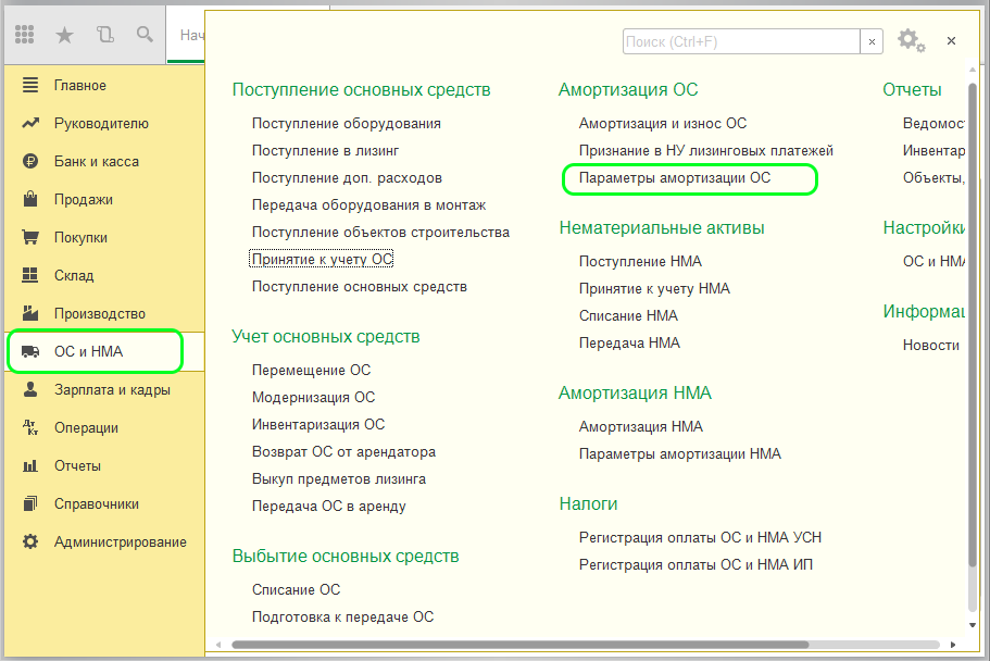 Если все в порядке, можно переходить к отражению расхода по лизинговым платежам. Для этого необходимо перейти во вкладку «ОС и НМА», отыскать там раздел «Амортизация ОС», и создать документ «Параметры амортизации ОС».