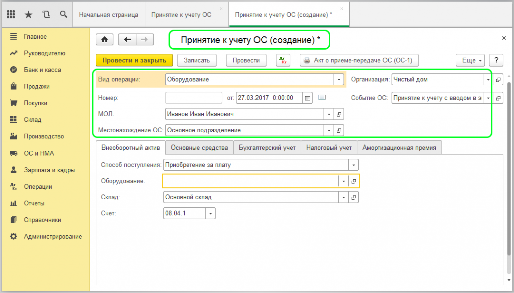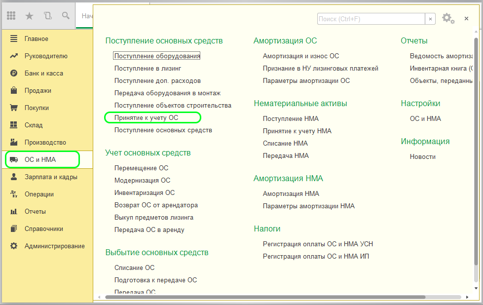Если все верно, необходимо подготовить документ «Принятие к учету ОС», для чего перейти во вкладку «ОС и НМА», где найти раздел «Поступление основных средств».