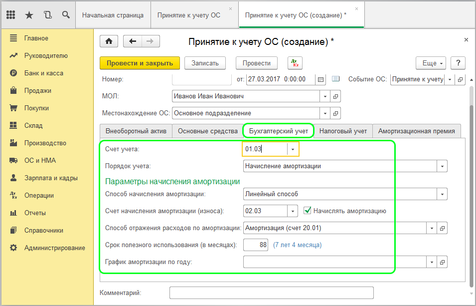 • В разделе Бухгалтерский учет следует заполнить поля «Счет учета» и «Порядок учета». Строку «Параметры начисления амортизации» следует заполнять только при необходимости.