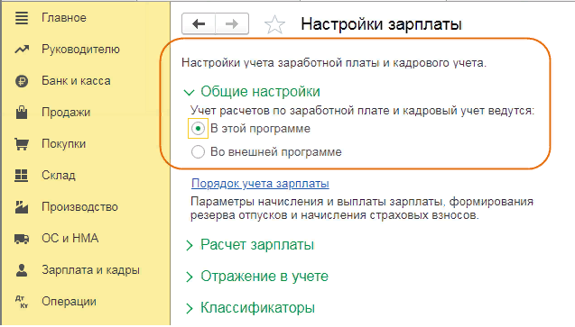 Выбор варианта нужно указать в меню «Зарплата и кадры», далее пройти в «Настройки зарплаты», выбрать блок «Общие настройки» и поставить переключатель в соответствующее положение: