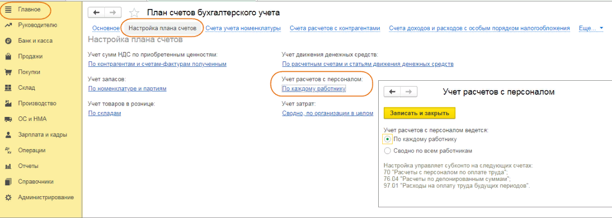 В меню «Главное» в разделе «План счетов» нужно проверить в настройках, какой переключатель установлен в блоке «Учет расчетов с персоналом». При этом возможны два варианта: