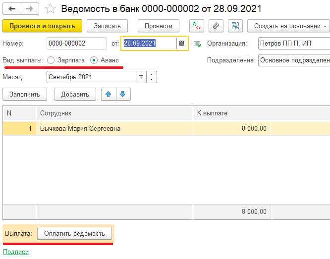 Для этого пользователь заходит в меню «Зарплата и кадры» и там оформляет ведомости в банк или кассу. При нажатии кнопки «Заполнить» автоматически заполняется таблица. Затем из этой ведомости можно создать документ на списание или выдачу наличных. По окончании заполнения документ нужно провести и закрыть.