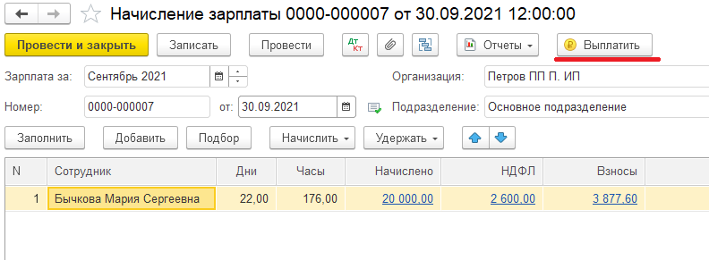 Месяц закрывается последним календарным днем. Нужно создать и провести документ «Начисление заработной платы». Автоматически заполнить документ работниками, размерами зарплаты, НДФЛ и взносами можно через кнопку «Заполнить».