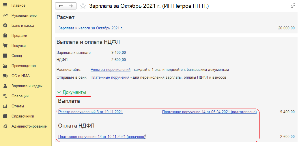 По кнопке «Выплатить» в документе «Начисление заработной платы» формируются документы на выплату зарплаты и уплату НДФЛ. Когда откроется новая форма «Зарплата», пользователь входит в блок «Документы» и разворачивает одноименную гиперссылку.