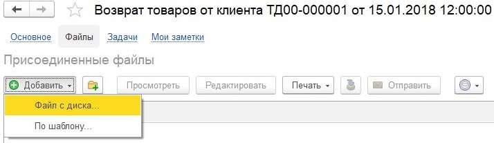 При необходимости прикрепите один или несколько файлов к документу, выберите вкладку «Файлы» и нажмите кнопку «Добавить» на панели инструментов: