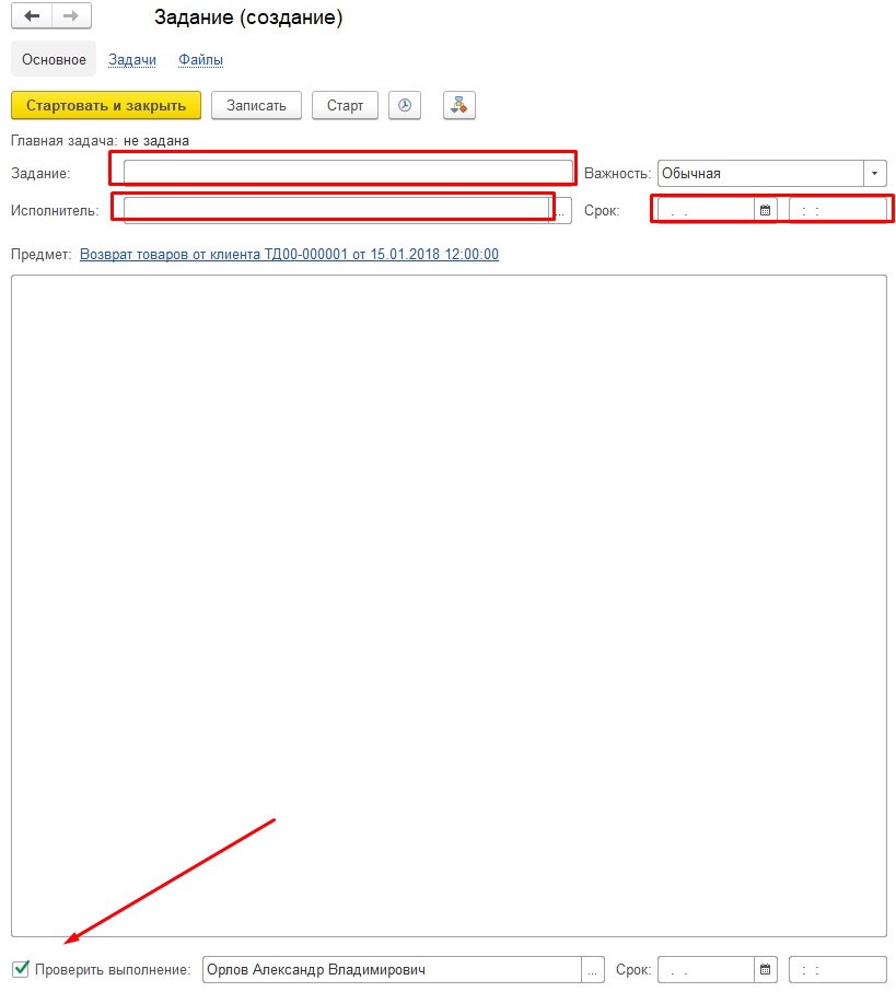 Флажок «Проверить выполнение» - после выполнения задачи исполнителем напоминается автору задачи проверить выполнение (на рабочем столе пользователя при открытии системы).