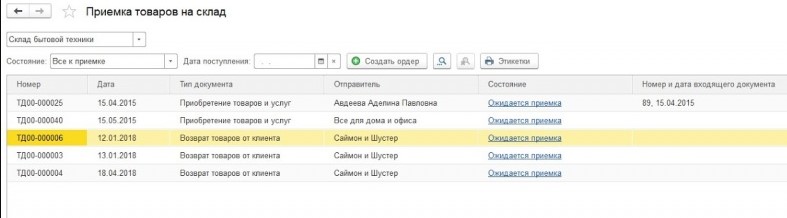 После документа в разделе «Склад и доставка» - «Склад заказов» - «Прием» будет отражена информация, по возврату которой необходимо оформить заказ на получение: