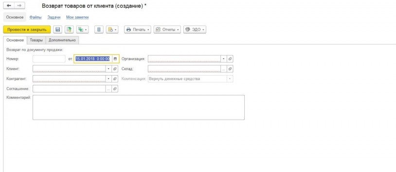 Если нажать на выделенную кнопку «Создать» - «Возврат от покупателя», то всплывёт соответствующее окно, которое предназначено для создания документации - Возврат от покупателя». Окно содержит заполненные таблицы (без типа компенсации и датирования). Следовательно, пустые пробелы необходимо заполнить самому вручную.