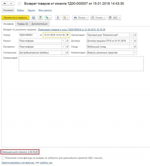Таким образом, документ «Возврат товара от покупателя» завершен и размещен. Если вы указываете несколько торговых документов взамен, они учитываются в подчиненной структуре.