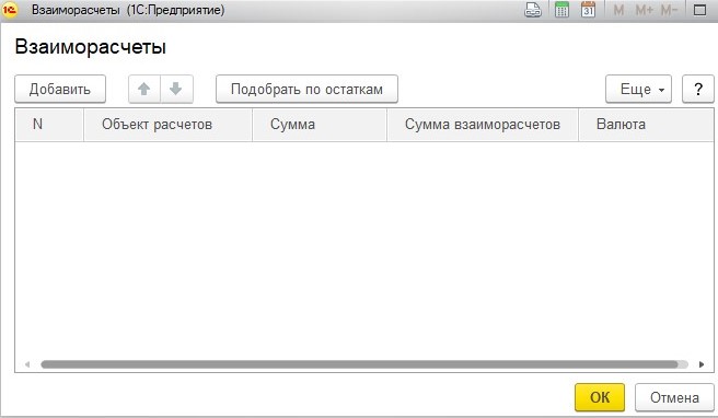 В последующем пользователь имеет возможность добавить документ взаимного счета (заказ клиента, договор, возврат товара покупателю), согласно которому будет уменьшена задолженность покупателя. Документация будет заполнена из списка объектов, которые будут доступны для подсчёта.