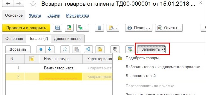 - Вручную: вы должны нажать на кнопку «Добавить», выбрать нужный товар из каталога «Номенклатура» и ввести количество и стоимость. Для автоматического заполнения информации о продаже вы можете использовать команду «Заполнить - заполнить торговые документы и цены». Программа автоматически вводит информацию о торговых документах и ценах, по которым были проданы возвращенные товары.
