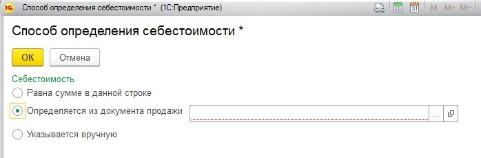 - Определяется из торгового документа. Товары возвращаются на склад по стоимости, зафиксированной на момент продажи (согласно указанному торговому документу, выбранному контрагентом и организацией, указанному в заголовке товара на выделенной строке).