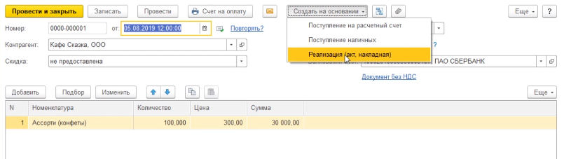 В нашем случае мы выставляли счет на сто единиц конфет ассорти. Необходимо отредактировать эту цифру до фактической отгрузки - восемьдесят штук. Мы это делаем вручную, прямо непосредственно в документе.