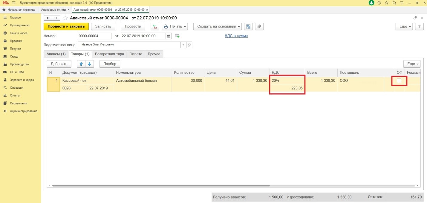 Достаточно часто подотчетные лица покупают на предприятие ТМЦ (товарно-материальные ценности), часто необходима заправка служебного транспортного средства топливом . За потраченные финансовые средства предприятия подотчетное лицо должно отчитаться и предоставить авансовый отчет, к которому должны быть подкреплены чеки ККТ. В данном документе содержится вся необходимая информация для отражения расходов и расходы достаточно просто отобразить в учете. Но случаются такие ситуации, когда НДС выделен, а счет-фактурой не подтвержден. У бухгалтеров по этому поводу очень часто возникает вопрос, можно ли НДС принять к вычету или включить его в стоимость самих ТМЦ. Ниже представлен практический пример из 1С:Бухгалтерии.