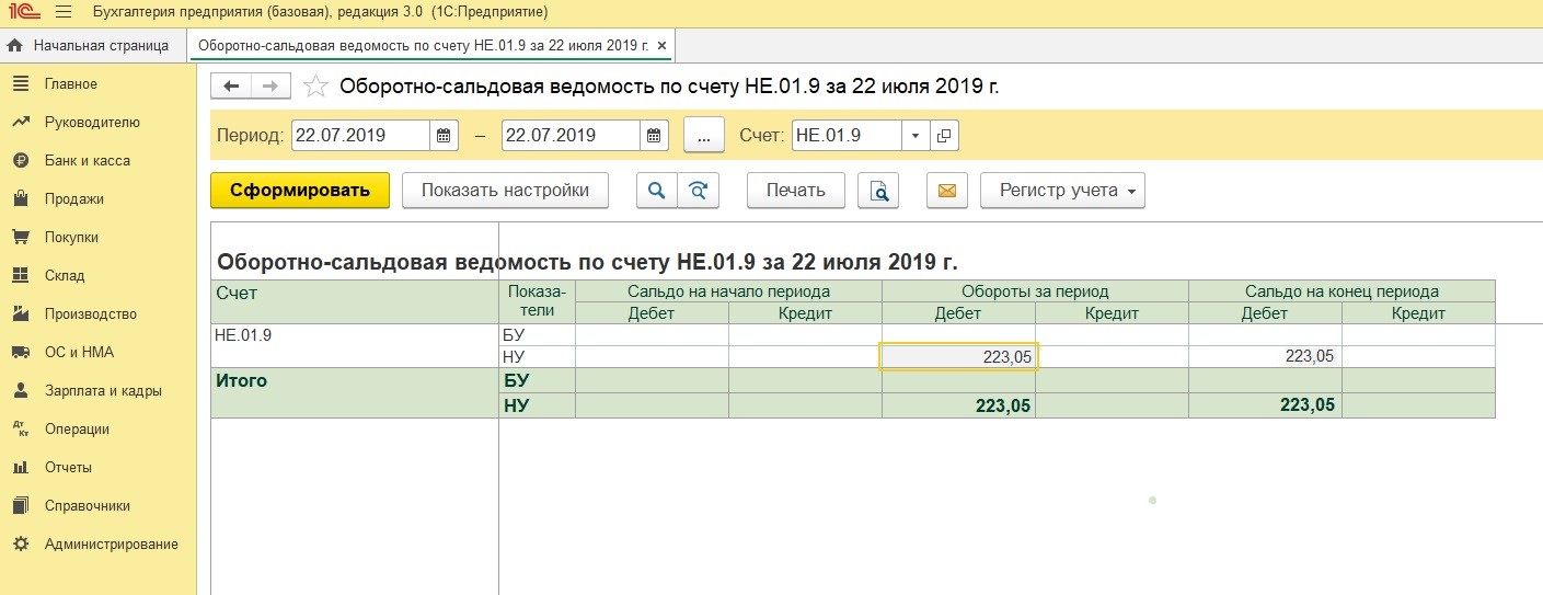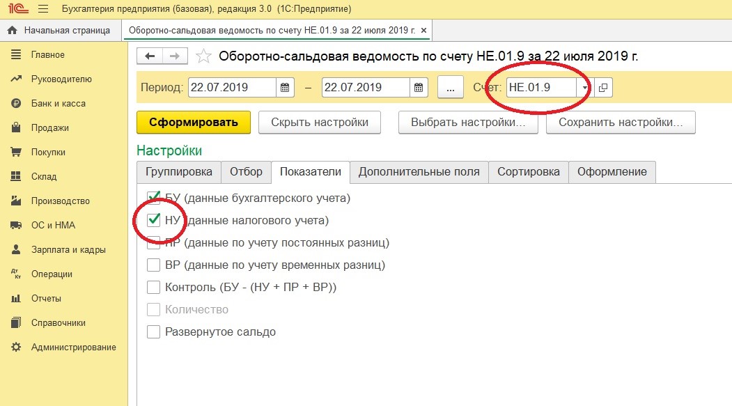 Чтобы провести анализ и понять какая сумма НДС списалась организацией за период, нужна ведомость по счету НЕ.01.9. В настройках отчета необходимо поставить галочку НУ. В настройках "Показатели" далее "НУ".