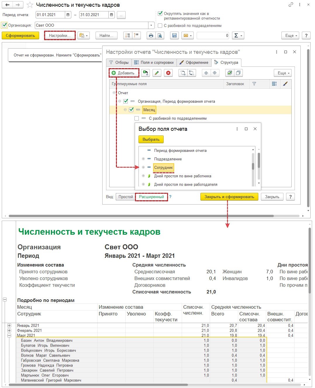 Чтобы сделать расшифровку среднесписочной численности из РСВ без ежемесячной разбивки, нужно провести настройку отчета «Численность и текучесть кадров».