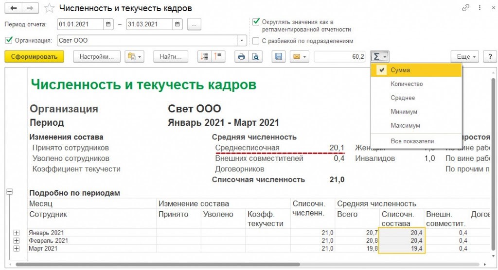 В данном отчете можно легко проверить, правильно ли рассчитался показатель среднесписочной численности за определенный период. Для этого нужно рассчитать величину среднесписочной численности в каждом месяце, а затем разделить на количество этих месяцев.