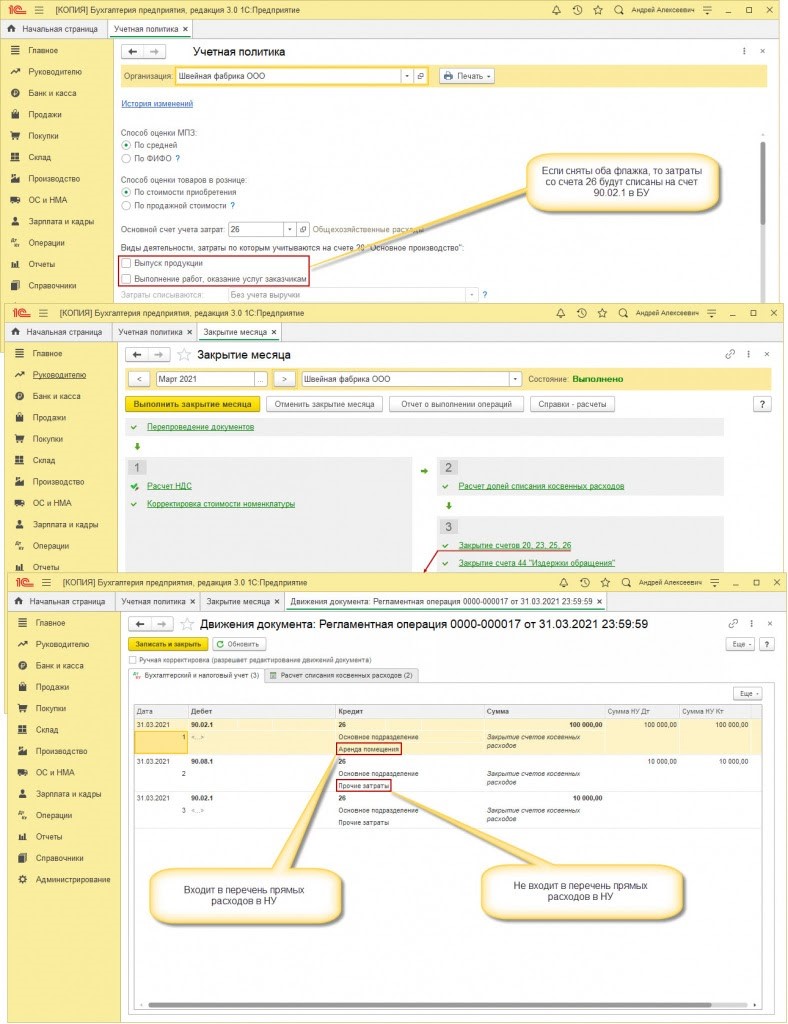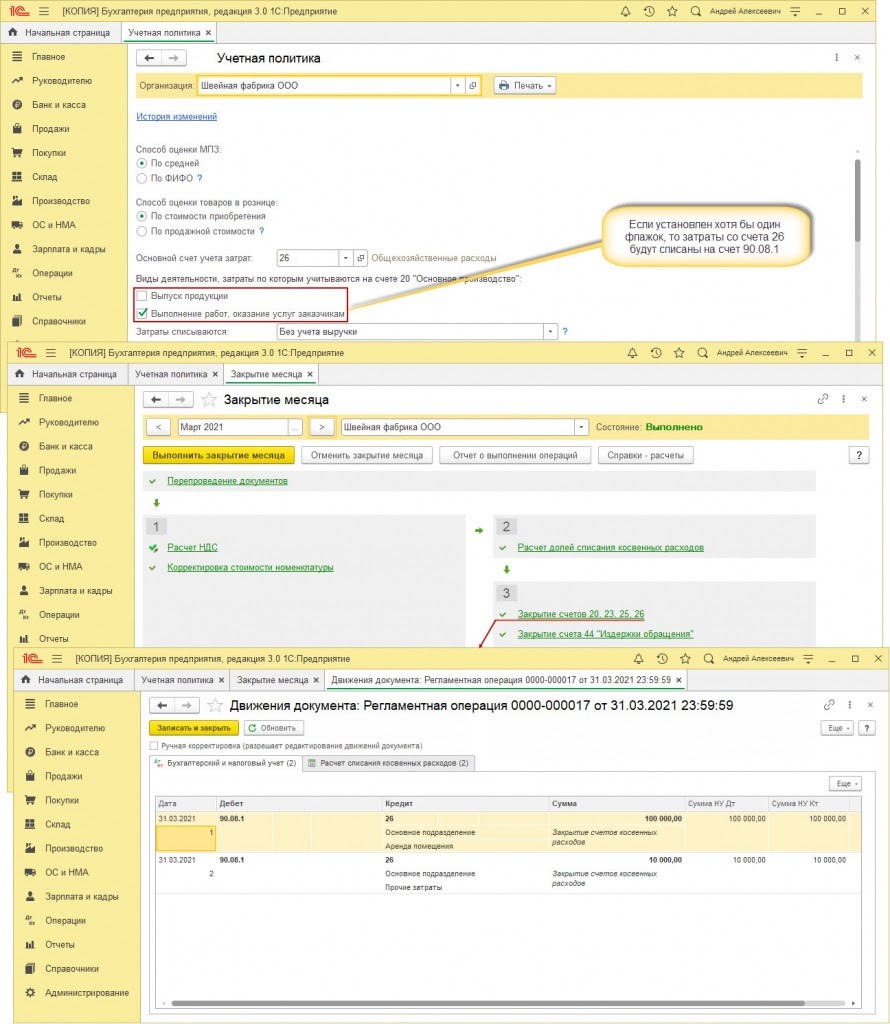 При закрытии месяца выполняется регламентированная операция «Закрытие счетов затрат 20, 23, 25, 26». При этом закрытие сч. 26 в бухгалтерском и налоговом учете производится на сч. 90.08.1 в случае, если в «Учетной политике» в 1С стоит хотя бы один флажок по пунктам: