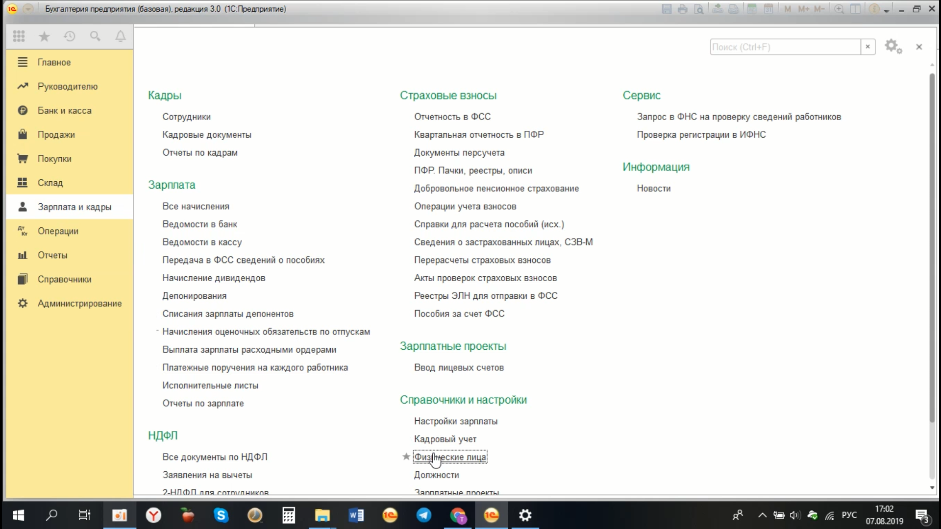 Прежде чем мы будем добавлять нового сотрудника, мы должны добавить новый элемент в справочник «Физические лица». Заходим «Зарплата и кадры», «Физические лица».