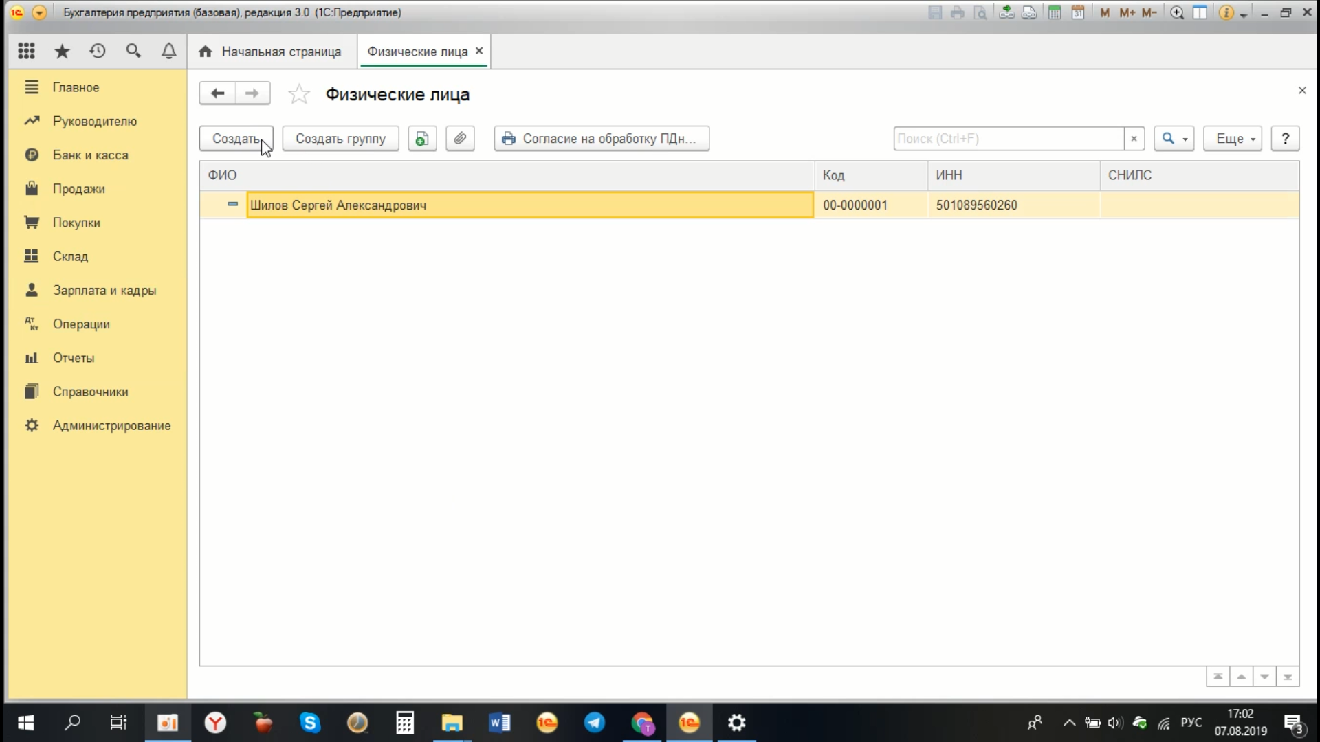 Здесь мы должны создать, с помощью кнопки «Создать», элемент Физическое лицо, которое в дальнейшем мы оформим в программе как сотрудника.