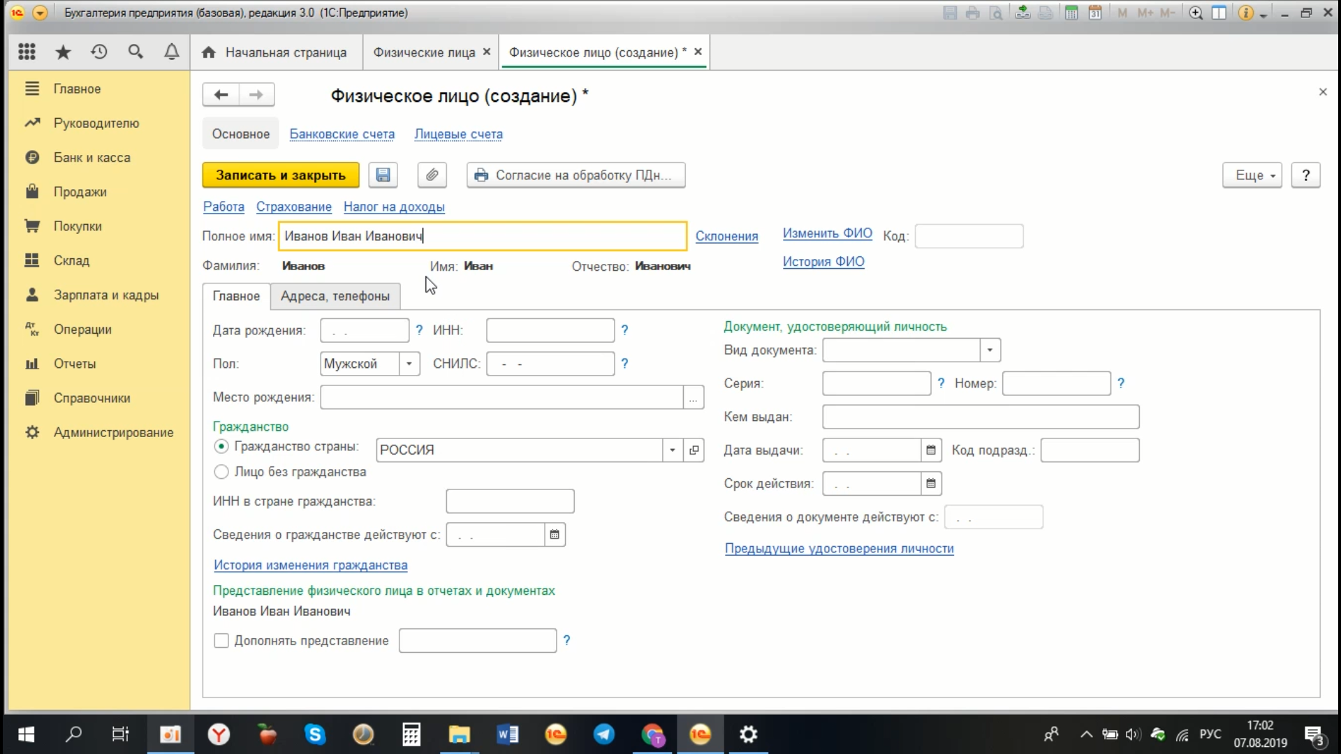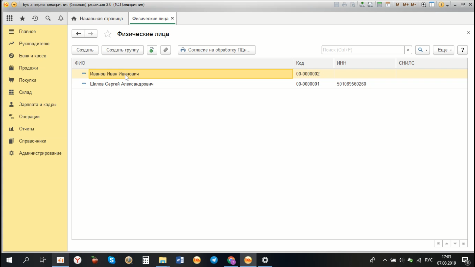 После того как мы все эти данные, всю информацию занесли, мы записываем наш элемент. У нас в справочнике «Физические лица» появился Иванов Иван Иванович.