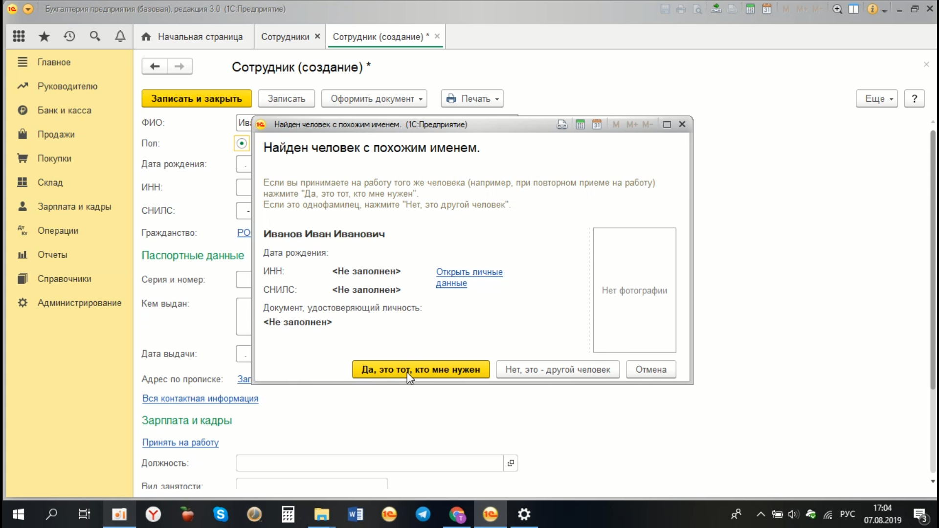 Начинаем набирать Фамилию, Имя, Отчество нашего сотрудника, нажимаем Enter. Программа нам говорит, что она нашла физическое лицо с похожим именем Иванов Иван Иванович. Если это полный тезка, то мы можем сказать «Нет, это – другой человек» и продолжить создание сотрудника дальше, либо говорим «Да, это тот, кто мне нужен», то самое физическое лицо, которое мы создаем как сотрудника.