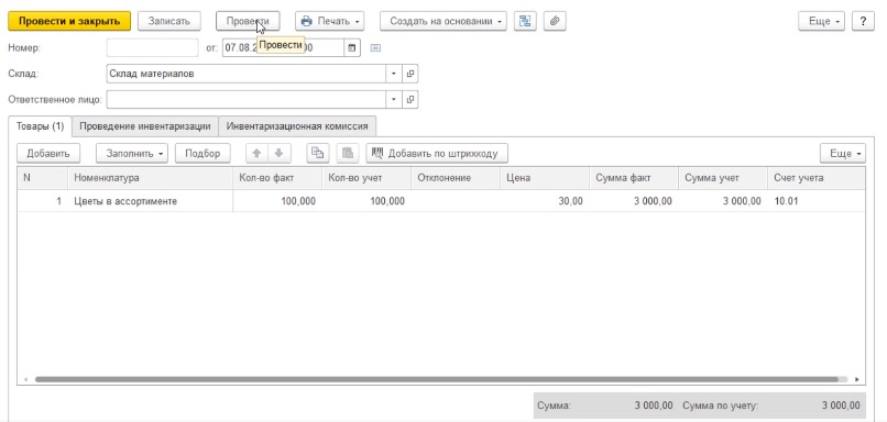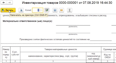 Документ инвентаризации готов. Можно вывести его на печать через кнопку печать, инвентаризационная опись товаров